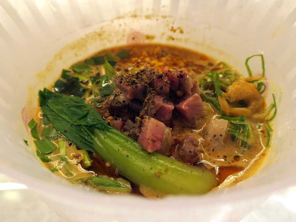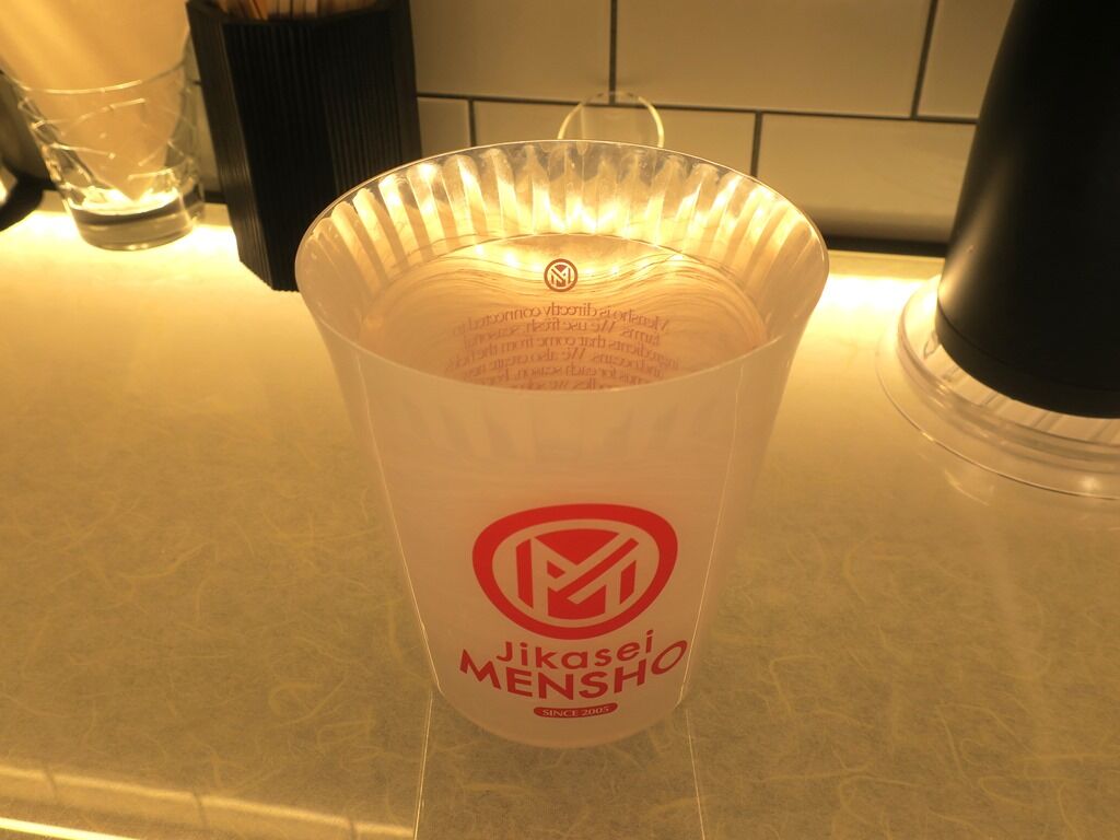写真で見るとカップヌードルのカップっぽいですが、実物はむしろビアジョッキに近いサイズ感の、独創的な器で着丼。