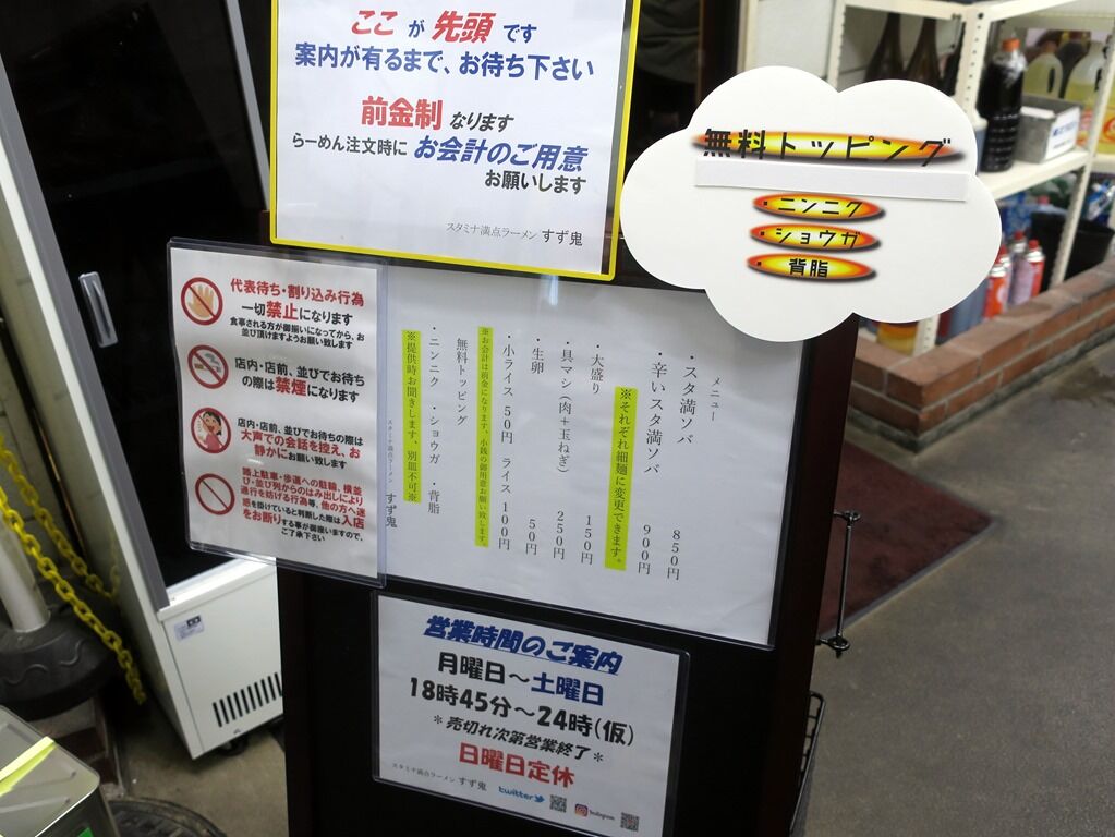 券売機は無く先会計制。主なメニューは、スタ満ソバ850円、辛いスタ満ソバ900円、他。麺を細麺に変更可能。無料トッピングはニンニク、ショウガ、背脂。コールのタイミングは提供直前。