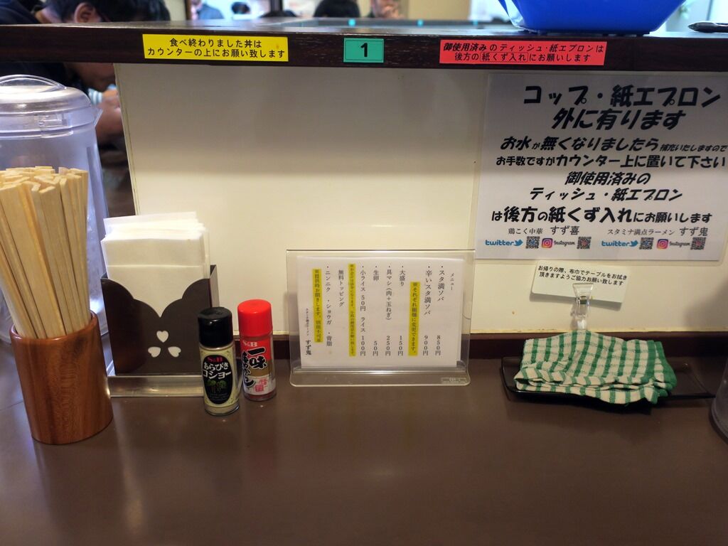 BGMはラジオかな?ほとんど聞こえず。箸は割り箸。卓上調味料 はS&Bあらびきコショー・一味唐辛子。