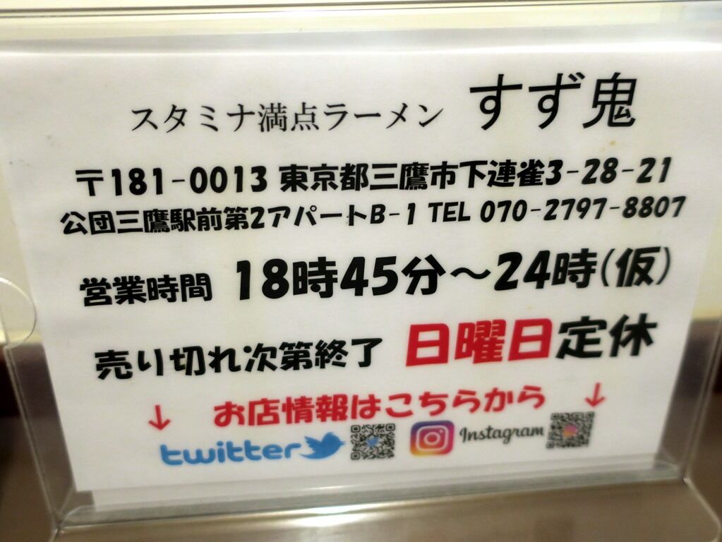 2019年11月25日、三鷹の新店「スタミナ満点ラーメン すず鬼」へ。