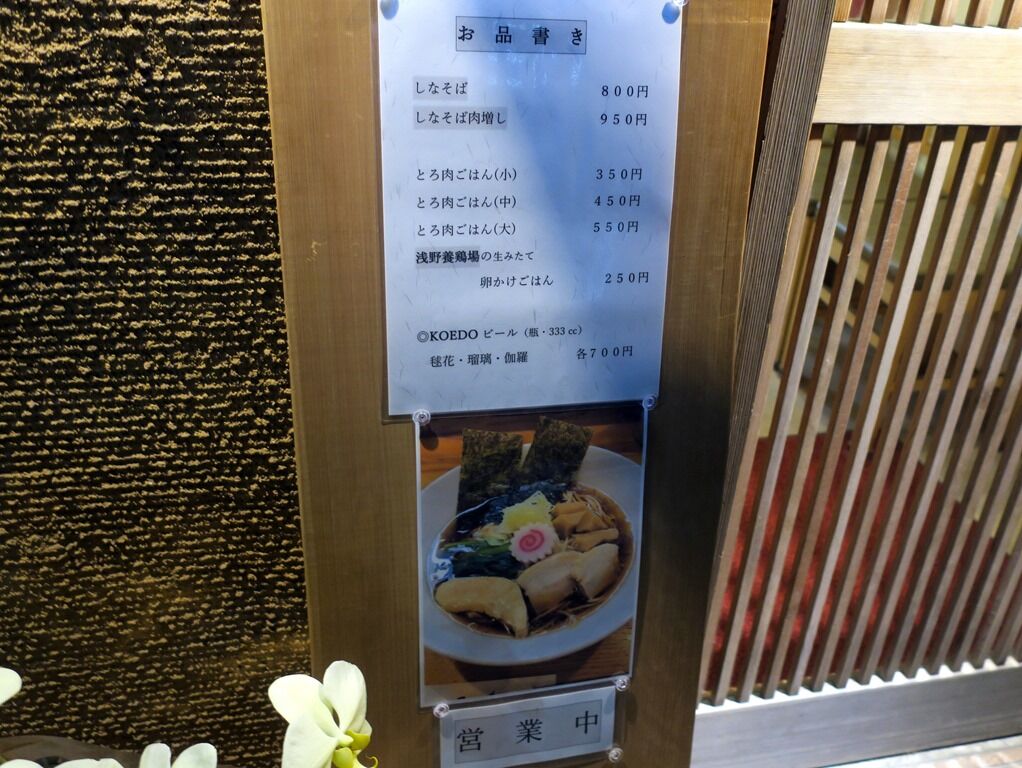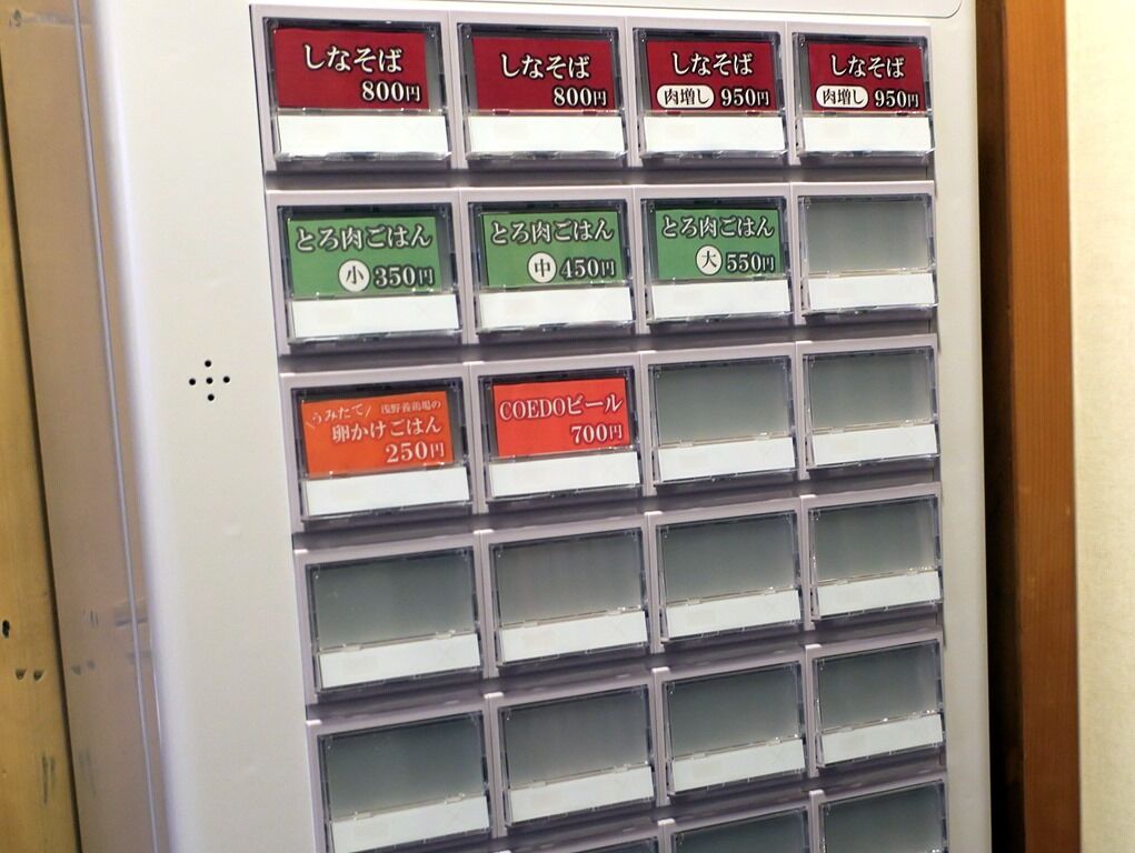入店するとまず券売機で食券購入です。主なメニューは、しなそば800円、しなそば肉増し950円、とろ肉ごはん小350円、他。