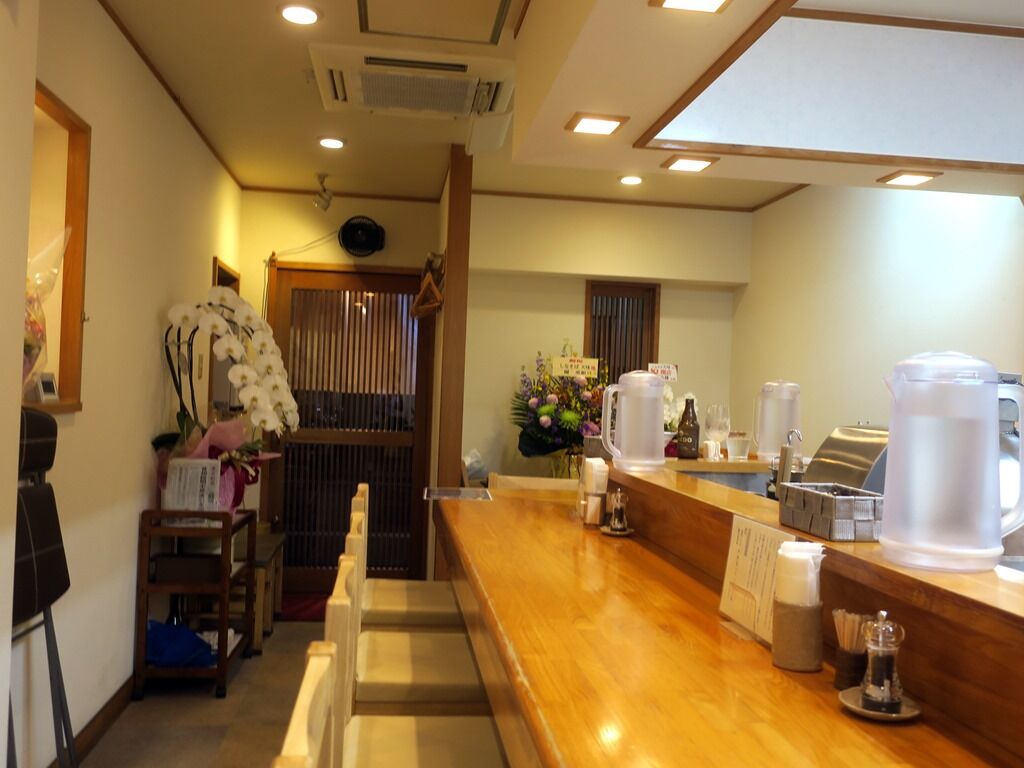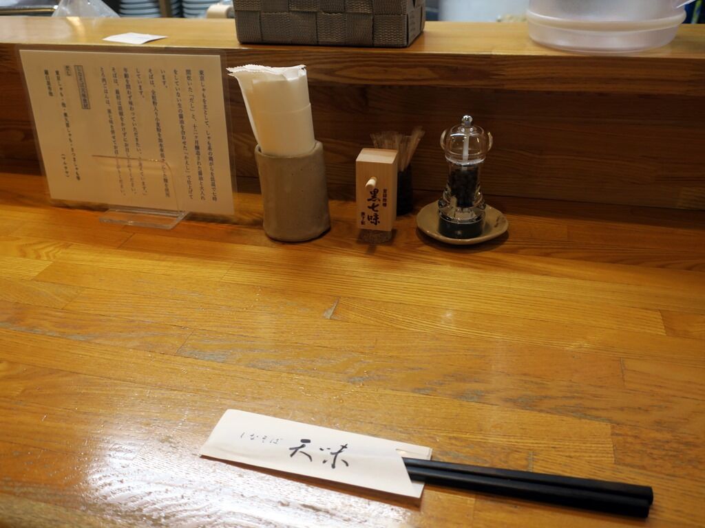 BGMは無しでお客さんが少ないとちょっと緊張感。箸は洗い箸でエコ仕様。卓上調味料は原了郭の黒七味、カンボジアの黒胡椒。