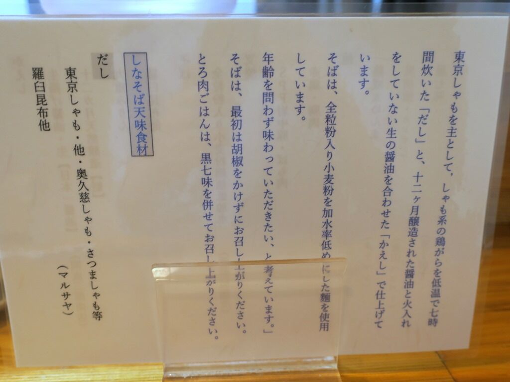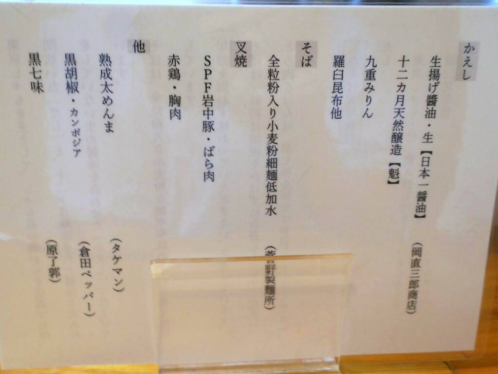 卓上メニュー立てにはこだわりの薀蓄。だしは東京しゃもメイン・奥久慈しゃも・さつましゃも、羅臼昆布等。かえしは生揚げ醤油(日本一醤油)、十二カ月醸造醤油(魁)。そばは全粒粉入り低加水麺。叉焼はSPF岩中豚、赤鶏胸肉。