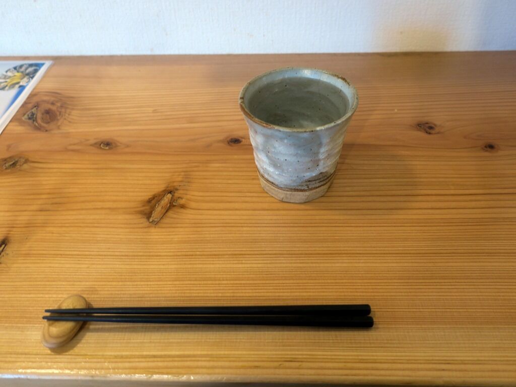 BGMはラテン調ミュージック。箸は洗い箸でエコ仕様。卓上調味料は無し。お冷は気前良く並々。