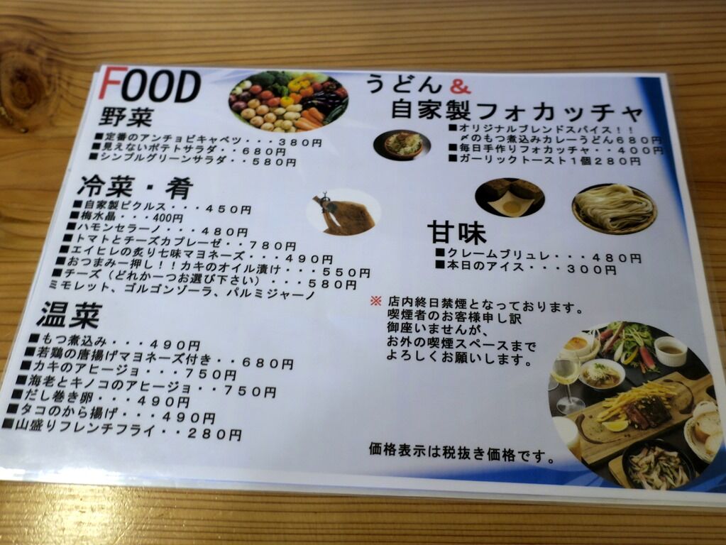 店内は、「ばる」ですがフルタイム完全禁煙。席は、厨房を囲むL字型カウンター5席(3・2)、4人卓x2、2人卓x2。13:40頃到着で始終貸し切り状態。厨房には店主さんワンオペ体制。実に気さくで話し好きの店主さんで、明るくリラックス出来るいい雰囲気の空間に。