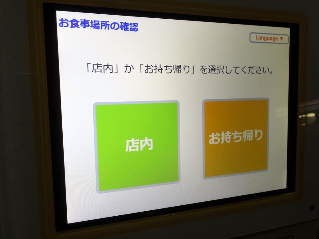 入店するとまずタッチパネル式券売機で食券購入です。まず店内食か持ち帰りか選ぶシステム。