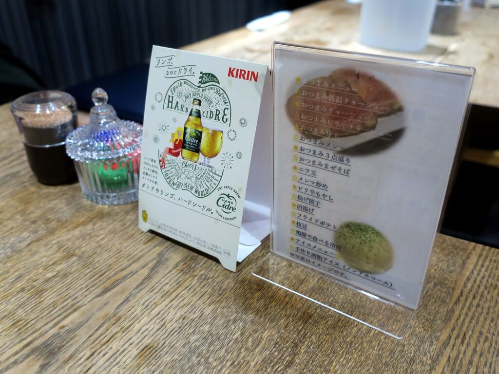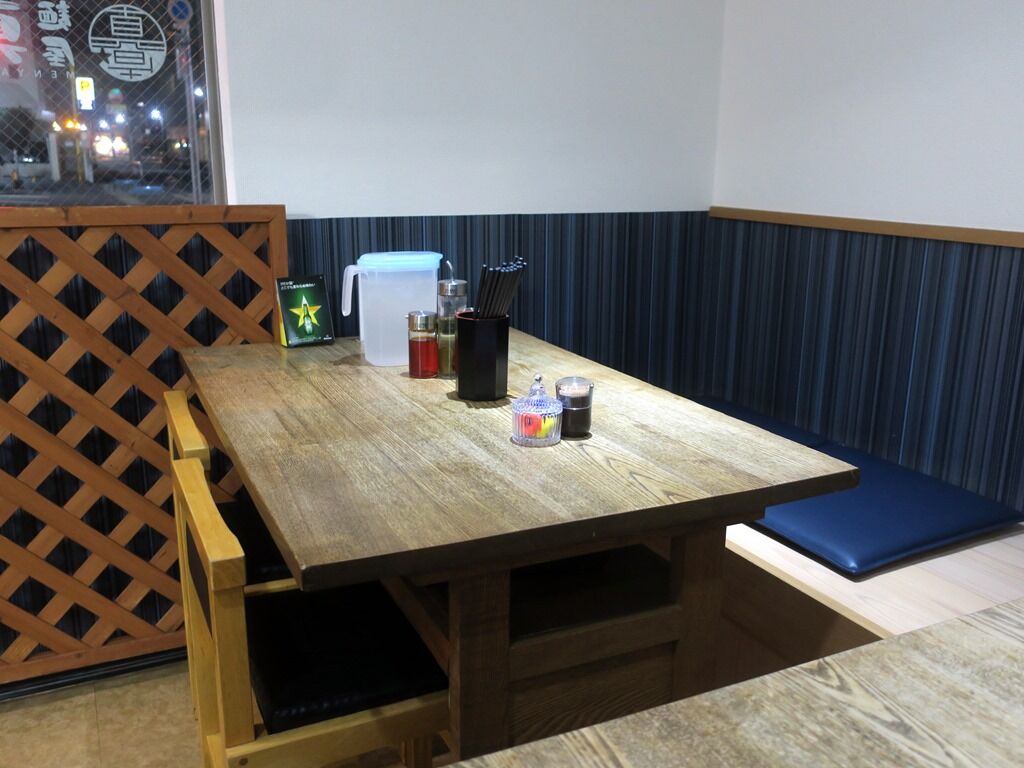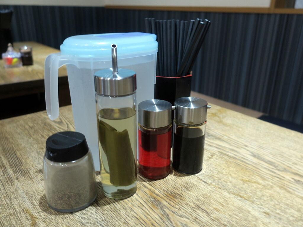 BGMはJ-POP。箸は洗い箸でエコ仕様。卓上調味料は胡椒、昆布酢、ラー油、醤油。