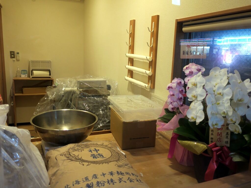 入口入って右手に外からも見えるガラス張りの製麺室。20:30頃到着で先客3後客1。スタッフは男性2。