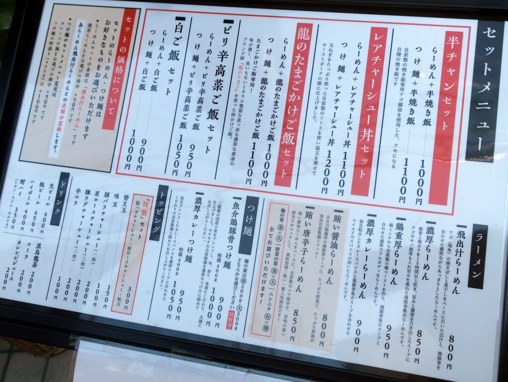 主なメニューは飛出汁らーめん800円、濃厚らーめん850円、鶏重厚らーめん950円、濃厚カレーらーめん900円、賄い醤油らーめん800円、賄い唐辛子らーめん850円、魚介鶏豚骨つけ麺900円、濃厚カレーつけ麺950円、他。半焼き飯、レアチャー丼、TKG、高菜ご飯とのセット推し。