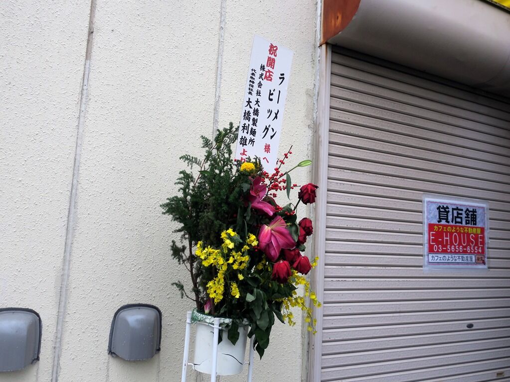 店頭には開店祝花。ラーメン関係では大橋製麺所から。