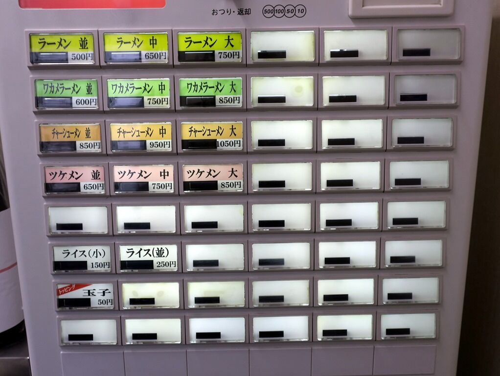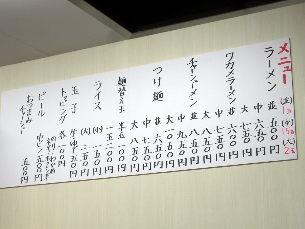 入店するとまず券売機で食券購入です。主なメニューは、ラーメン並500円、ワカメラーメン並600円、チャーシューメン850円、ツケメン並650円、他。 券売機はまだスカスカで、玉子以外のトッピングは口頭注文かも。