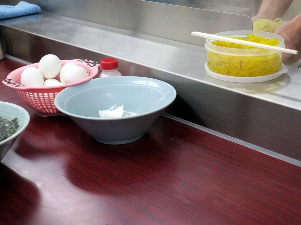 BGMはラジオ放送。箸は割り箸。卓上調味料は、酢、豆板醤、GABANブラックペッパー、業務用おろしにんにくの大型ボトル。ゆで卵50円には塩も用意。きざみたくあんはライス用。