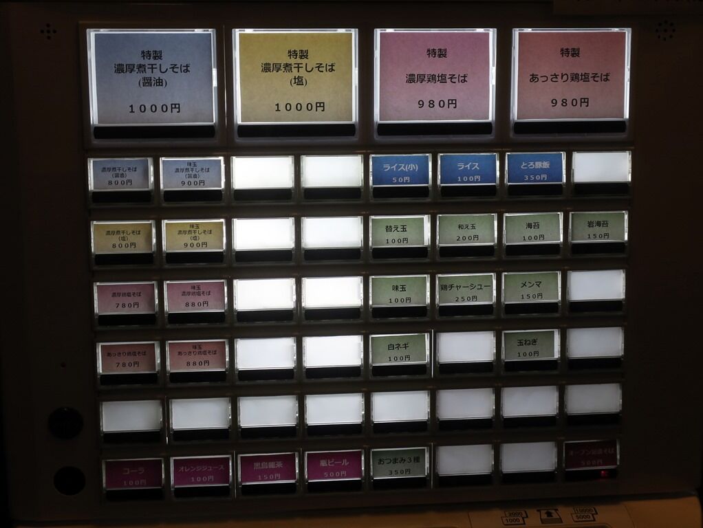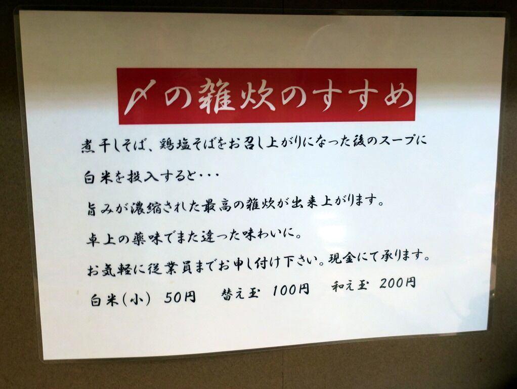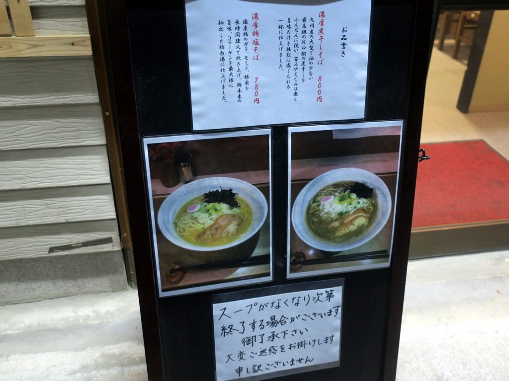 入店するとまず券売機で食券購入です。主なメニューは、濃厚煮干しそば醤油800円、濃厚煮干しそば塩800円、濃厚鶏塩そば780円、あっさり鶏塩そば780円、和え玉200円、白米小50円、他。公式HPにクーポンがありましたが、チェックインが必要みたいだっだので行使しませんでした。
