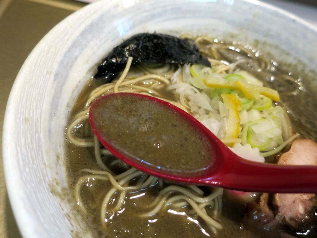 スープはどろっと濃厚なチョコレートグレーの煮干白湯醤油味。猛烈に濃い煮干し出汁ですが、エグミ、苦味、酸味は皆無。そして、濃厚煮干しにありがちな塩分高めでしょっぱ目もなのも無し。むしろ芳醇なうま味由来の自然な甘み、甘さが感じられます。ど濃厚なのに飲み干さずにはいられないスープで、とてつもなく美味しい!
