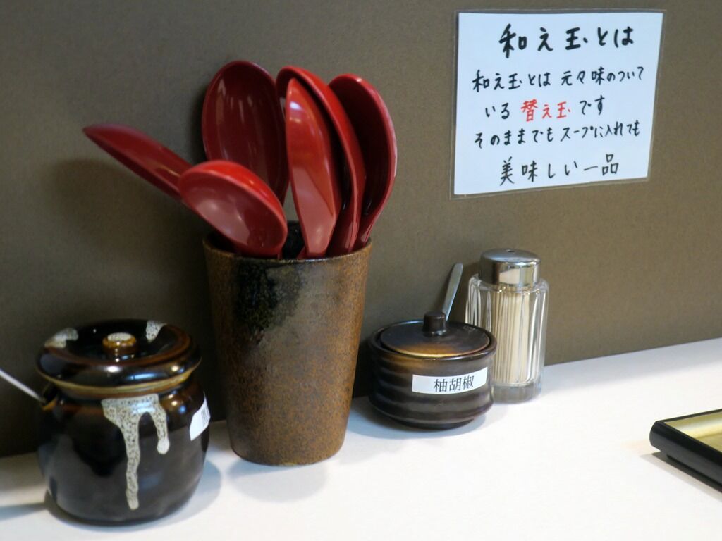 スタッフは厨房に店主さんと、サポートの女性は女将さんでしょうか。2オペ体制。BGMは三味線の調べ。箸は洗い箸でエコ仕様。卓上調味料は黒マー油、柚子胡椒。