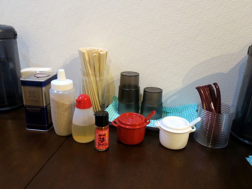 BGMはラジオ。箸は割り箸。卓上調味料は、GABANブラックペッパー、切り胡麻、酢、Hachi一味とうがらし、豆板醤、おろしにんにく。