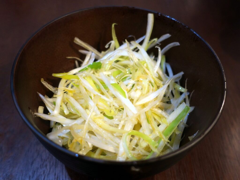 サービスの白髪ネギにはラー油がかけられていて、ピリ辛仕立て。途中でネギラーメンにして濃厚スープのフレッシュなネギのシャキシャキ感を楽しみます。