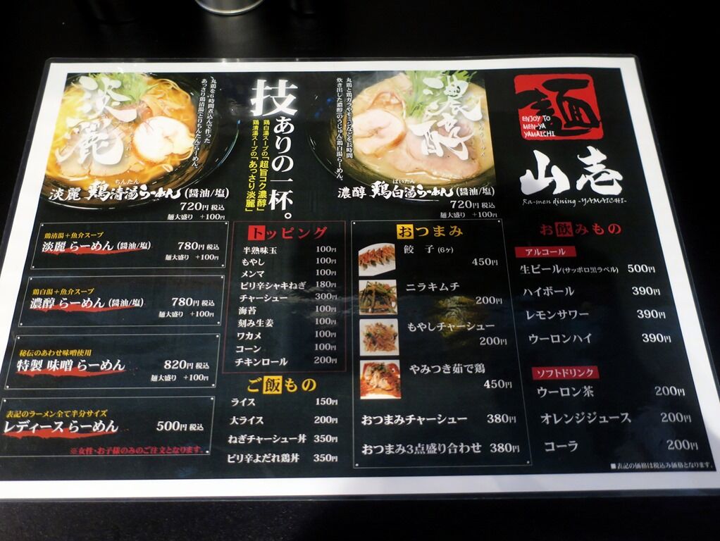 券売機は無く後会計制。主なメニューは、淡麗鶏清湯らーめん720円、淡麗らーめん(鶏清湯+魚介)780円、濃醇らーめん(鶏白湯+魚介)780円、特製味噌らーめん(あわせ味噌)820円、レディースらーめん500円、他。淡麗・濃醇にはそれぞれ醤油・塩あり。