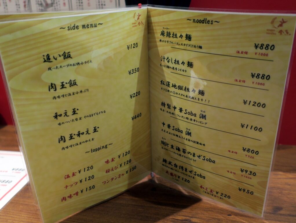 券売機は無く後会計制。主なメニューは、麻辣担々麺880円、汁なし担々麺880円、中華Soba潮800円、浅利と生海苔のまぜSoba 930円、和え玉220円、他。