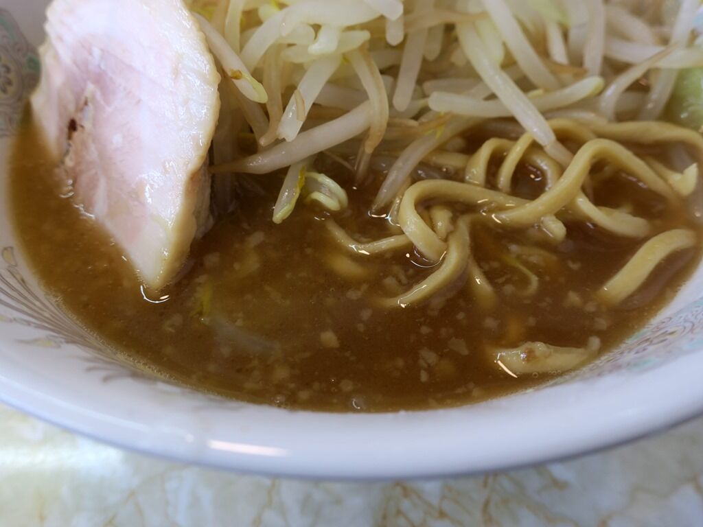 レンゲの用意は無いので丼から直接スープを飲むスタイル。そのスープは相当乳化が進んだ濃いブタ出汁醤油味。昔の「松ちゃんらーめん」は非乳化のライトな二郎系でしたが、めちゃ進化してますね。麺少なめのためかやや味濃いめながら、スープが力強くパワフルでグイグイ食べさせてくれます。こりゃ美味しい!