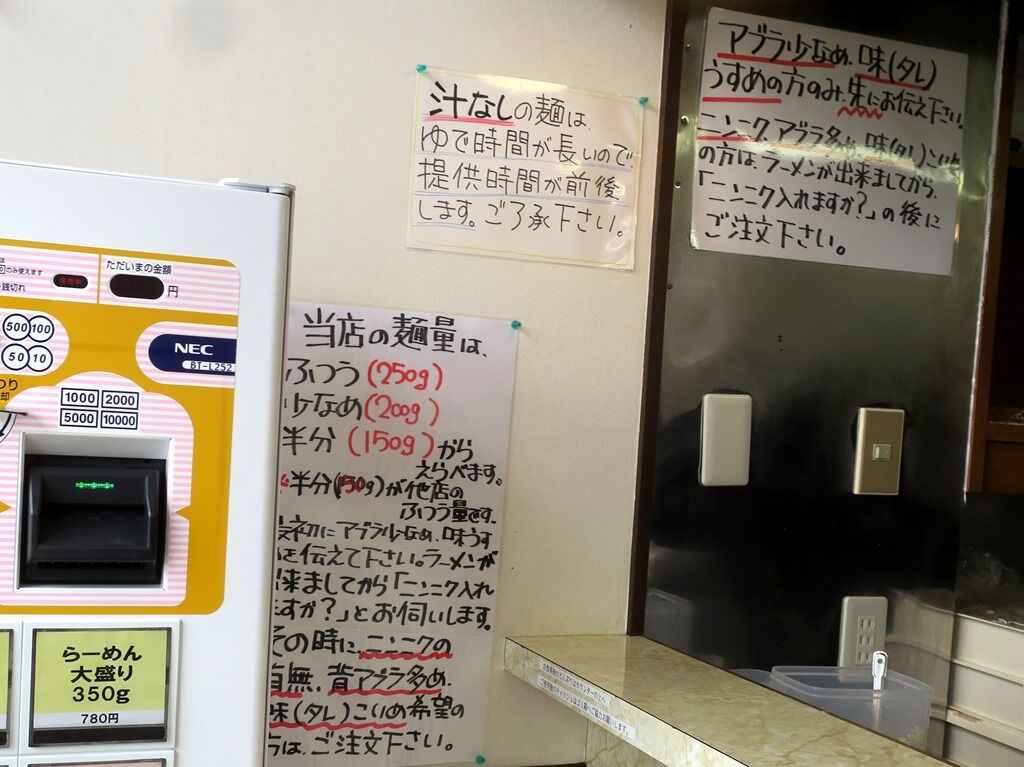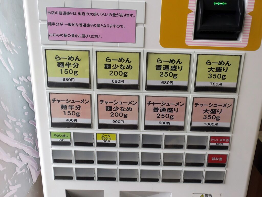 入店するとまず券売機で食券購入です。主なメニューは、らーめん麺半分150g680円、麺少なめ200g680円、普通盛り250g、大森350g780円、汁なし変更100円、他。