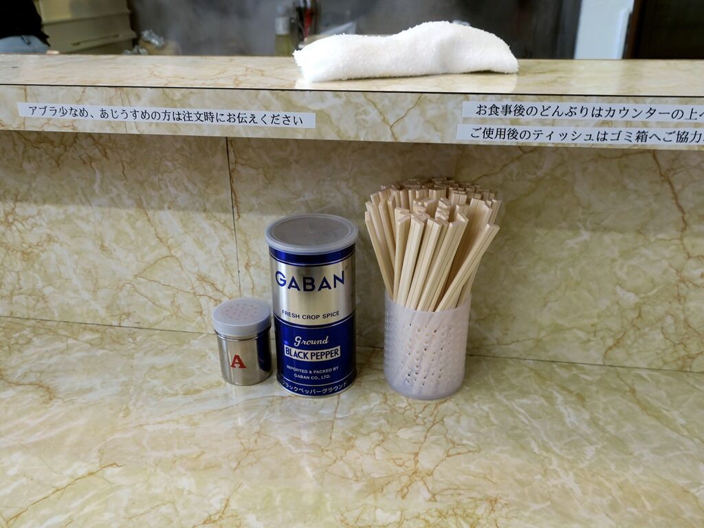 BGMはポップス。箸は割り箸。卓上調味料は一味唐辛子、GABANブラックペッパー。