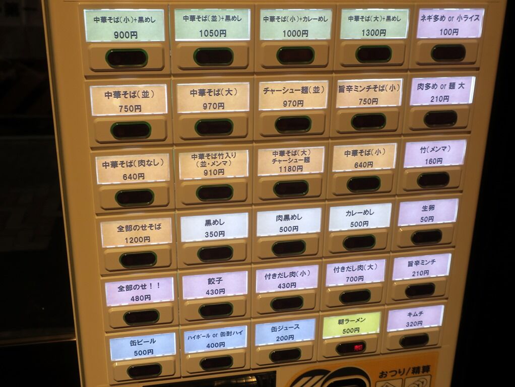入店するとまず券売機で食券購入です。主なメニューは、中華そば並750円、旨辛ミンチそば小750円、黒めし350円、肉黒めし500円、カレーめし500円、他。