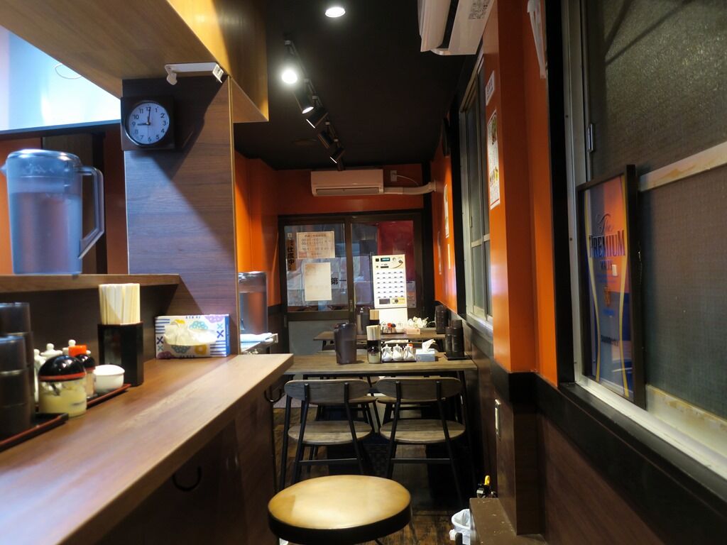 BGMは東京FM。箸は割り箸。卓上調味料は、餃子のタレ、辣油、酢、S&B一味唐がらし、胡椒、自家製らしい辛味、おろしニンニク。