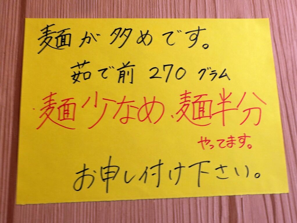 麺量はゆで前270gと大容量。麺少なめ・麺半分可能。麺の種類はらーめん・汁なしが強力粉100%の縦切ワシワシ極太麺、中華そばが準強力粉・うどん粉MIXの角切りムチムチ太麺。