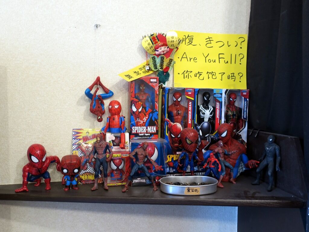 券売機横にスパイダーマンのコーナー!? トイレはいったん外出て裏へ。