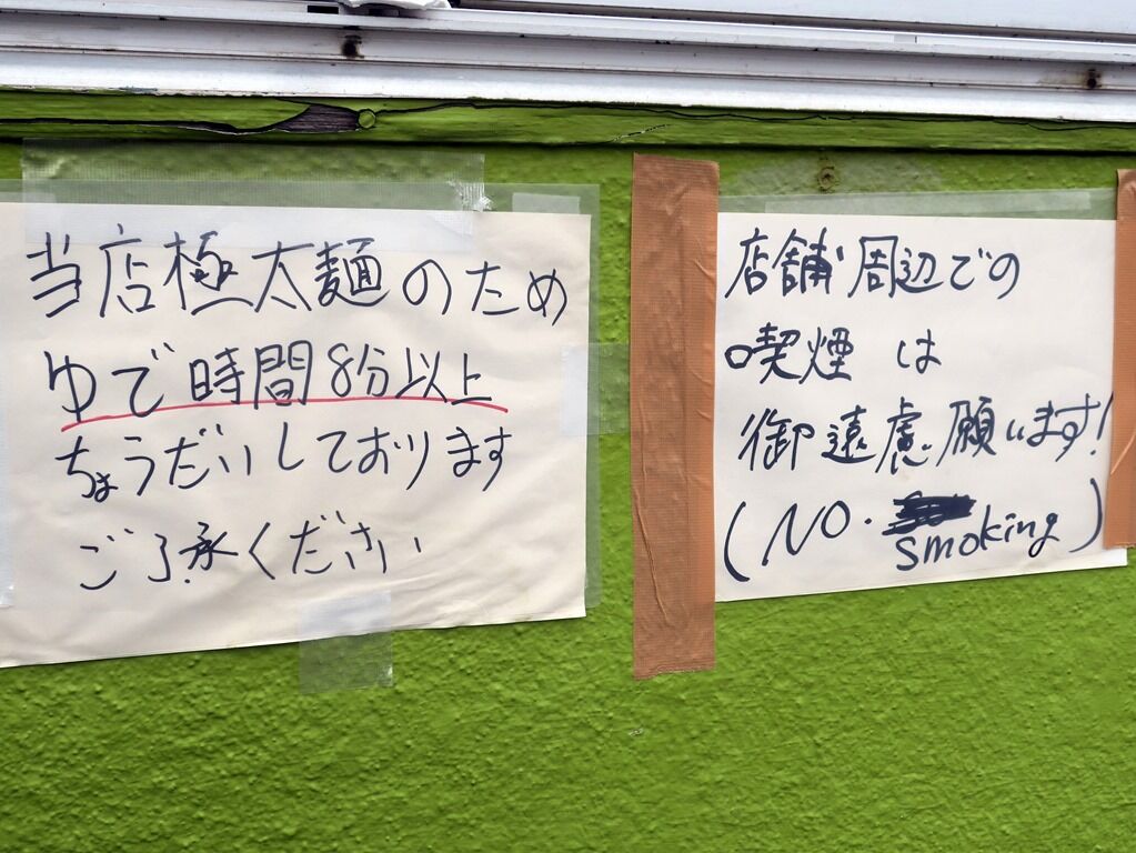 店内は厨房前に真っ直ぐなカウンター4席、壁にくっつけたテーブルをコの字型カウンターに見立てた4席、計8席。開店後程なく満席、退店時外待ち4。