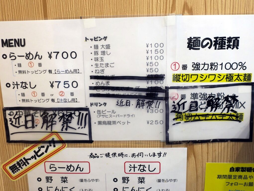 主なメニューは、らーめん700円、汁なし750円、中華そば650円(coming soon)、他。