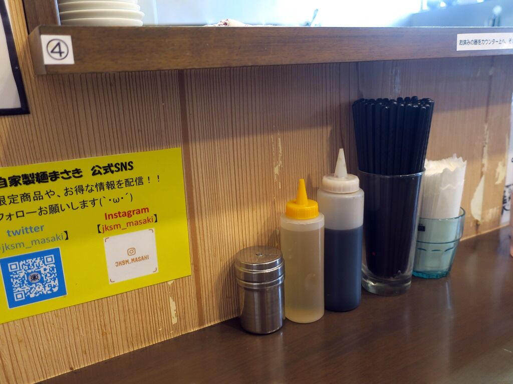 スタッフは店主さんとサポートの男性、途中から女性にチェンジの2名体制。BGMはヘビメタ。箸は洗い箸でエコ仕様。卓上調味料はブラックペッパー、酢、タレ。