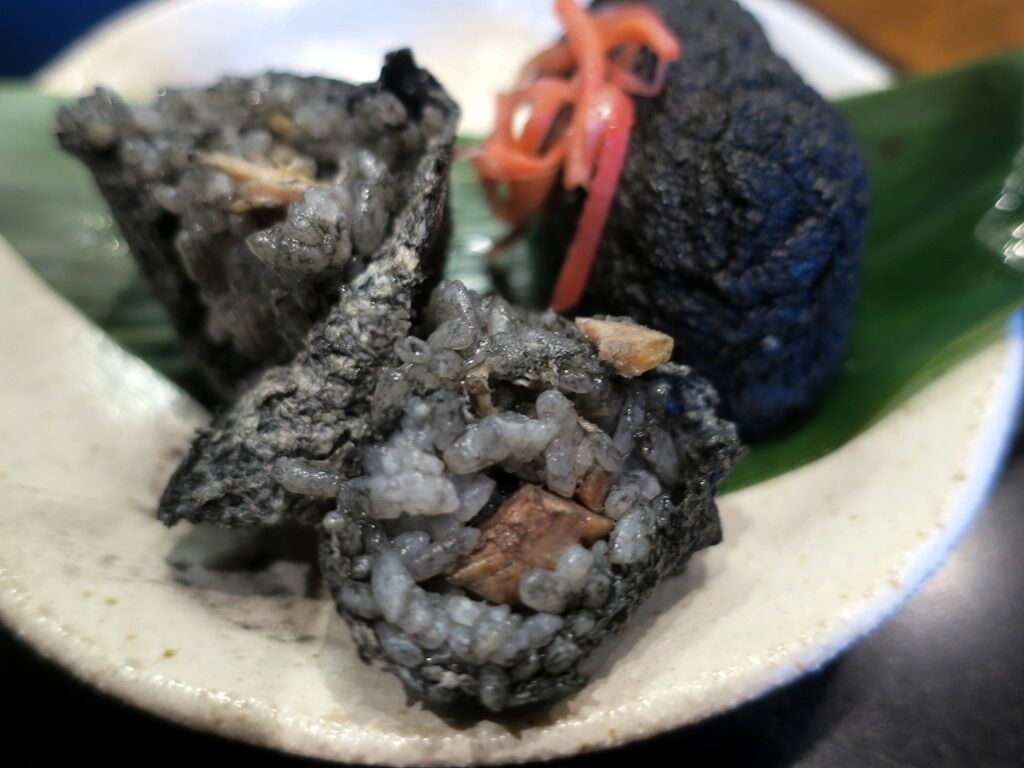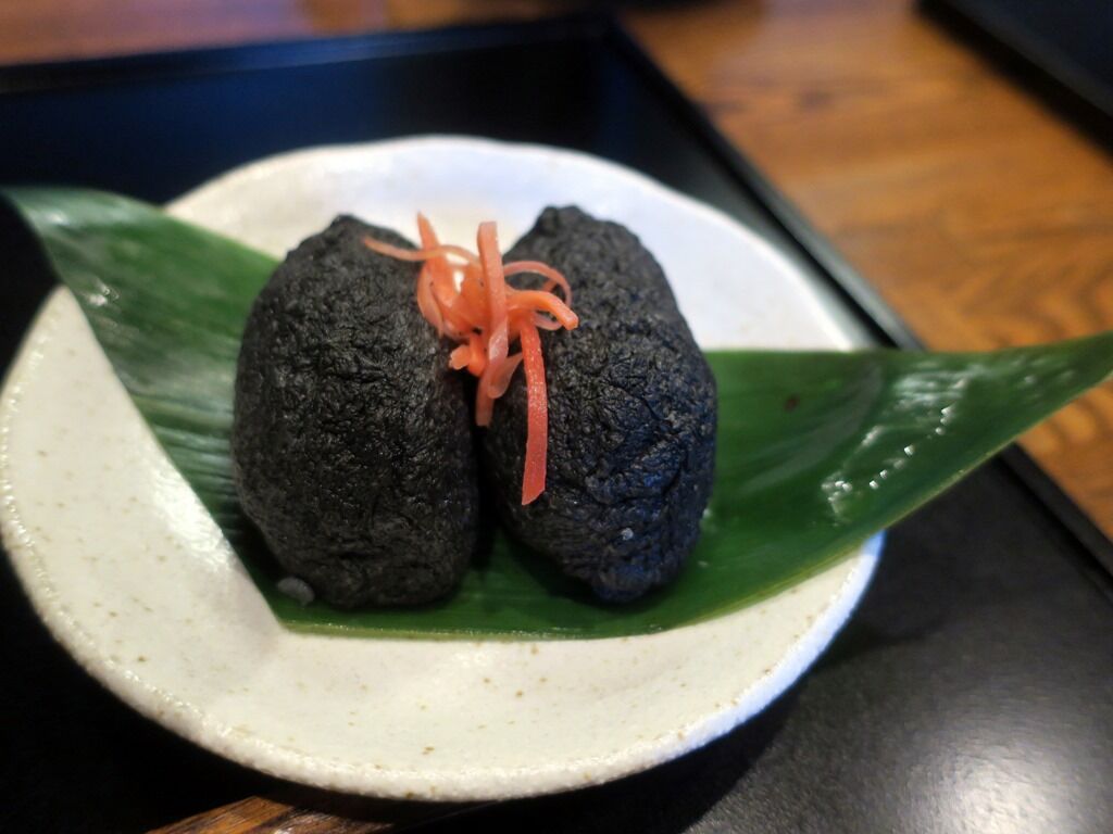 「稲荷寿司」。和歌山産竹炭で染め上げてあって中も外も真っ黒。
