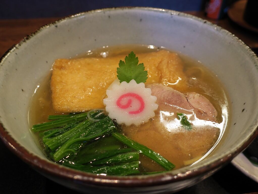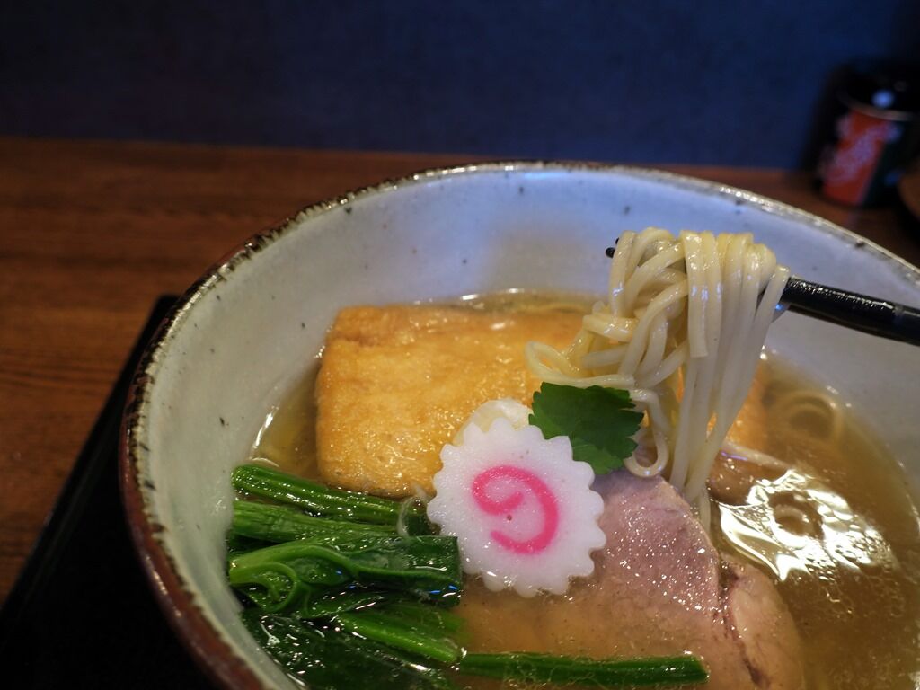 スープはさらさらの無化調清湯塩っぽい醤油味。驚くほどお揚げの出汁がバッチリ効いたうま味たっぷりのスープで、オリジナリティ溢れる味わい。そのままだとうどんのつゆになりそうですが、香味油で鮮やかにラーメンらしさを演出。まさにきつね流中華蕎麦ですごく美味しい!