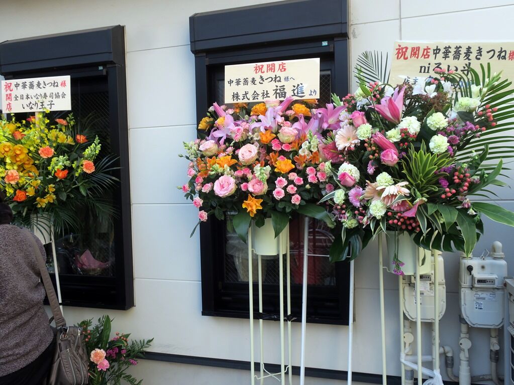 30分前到着でシャッター待ち2に接続。店頭開店祝花は、三河屋製麺、
