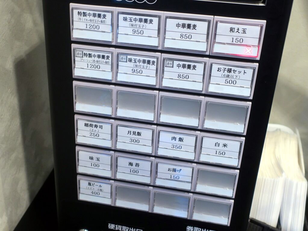 定刻1分過ぎにオープン。開店時13名の列び。入店するとまず券売機で食券購入です。主なメニューは、中華蕎麦850円、濃厚中華蕎麦850円、和え玉150円、稲荷寿司250円、月見飯300円、肉飯350円、他。