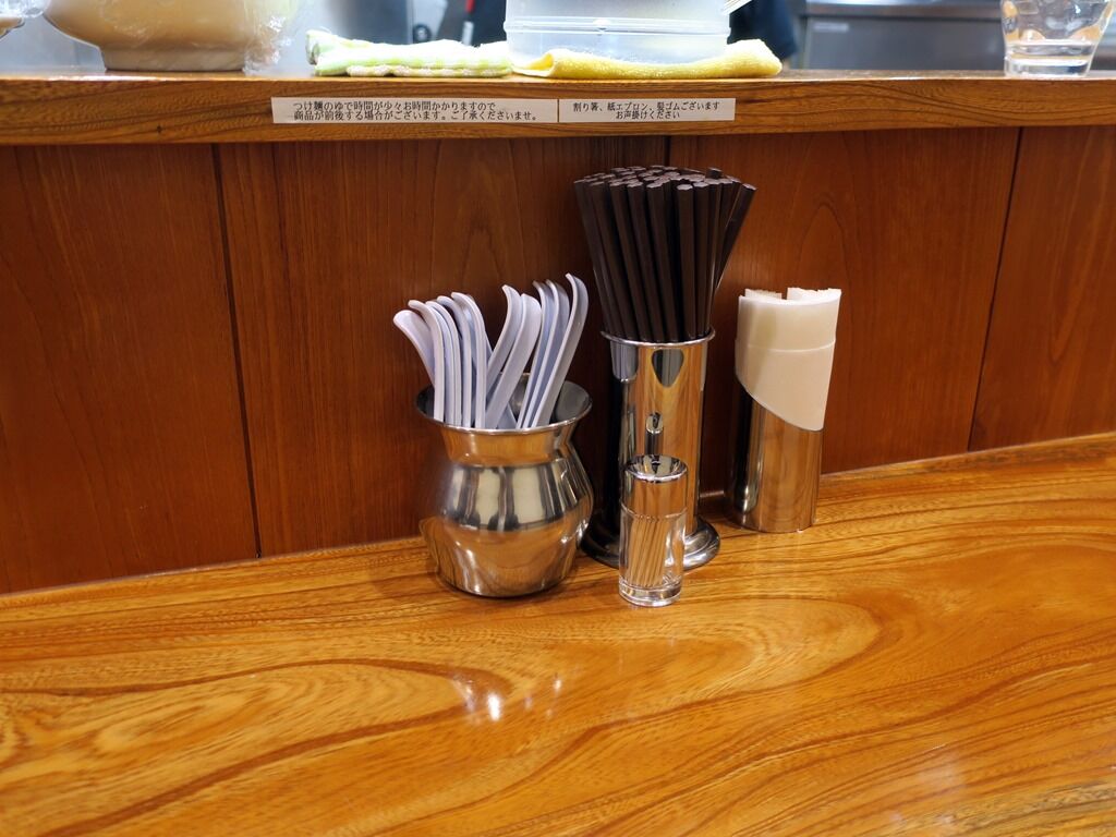 BGMはJ-POP。箸は洗い箸でエコ仕様。卓上調味料は無し。