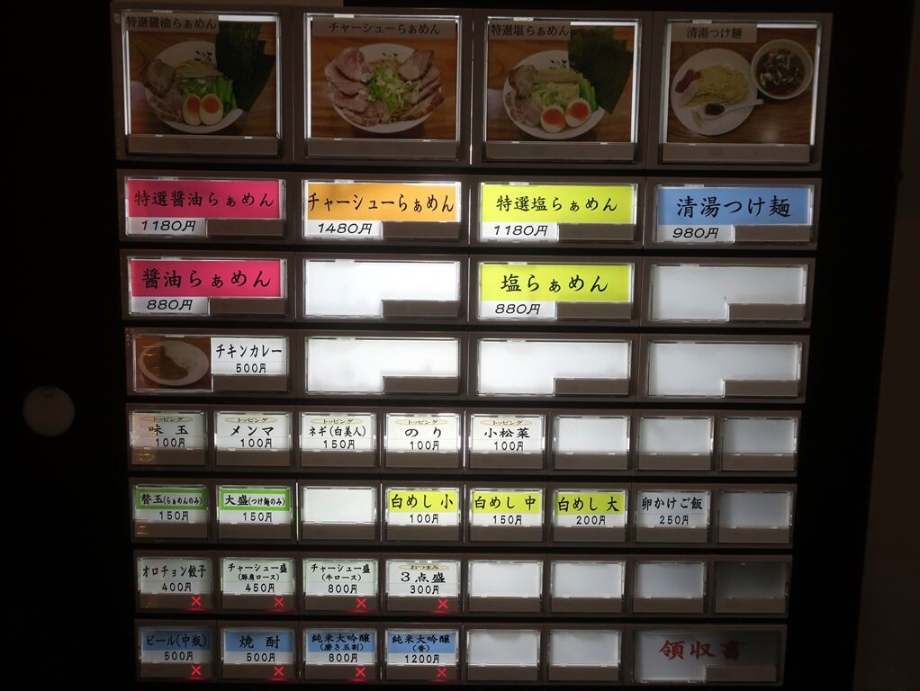 入店するとまず券売機で食券購入です。主なメニューは、醤油らぁめん880円、塩らぁめん880円、清湯つけ麺980円、チキンカレー500円、他。
