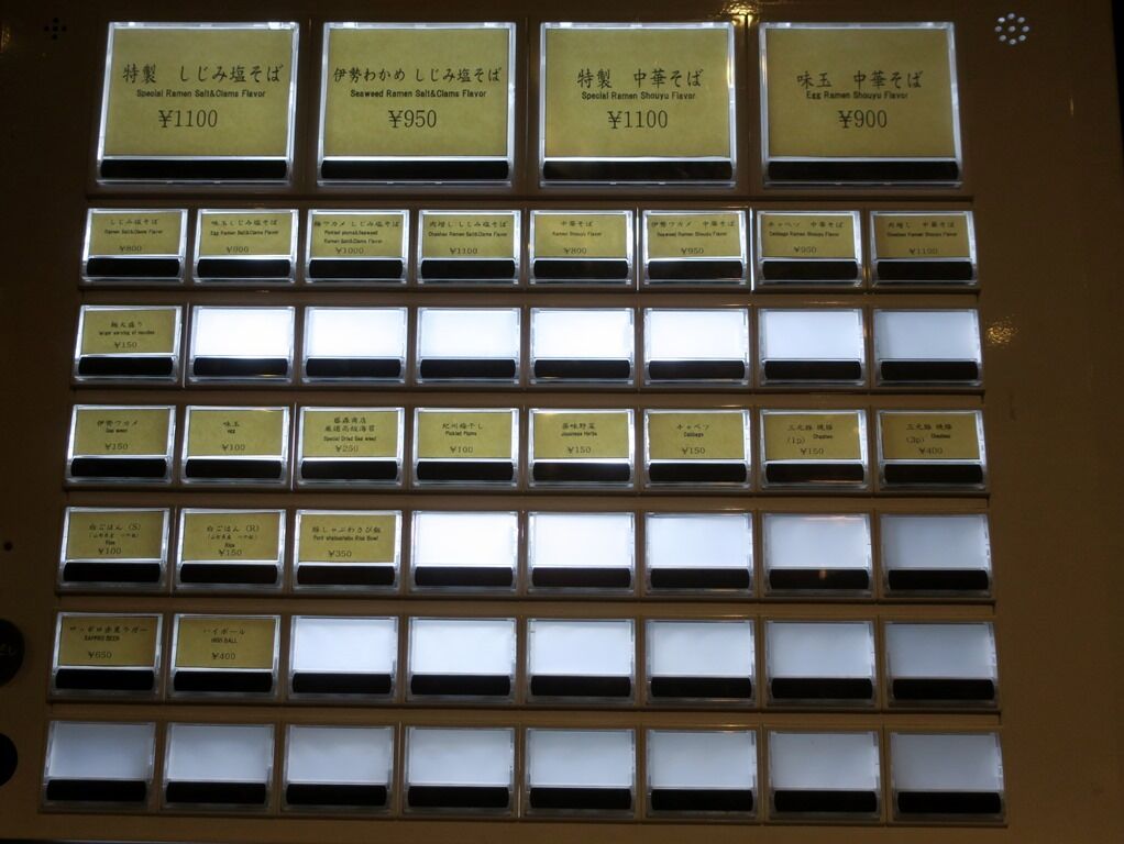 入店すると、まず券売機で食券購入です。主なメニューは、しじみ塩そば800円、中華そば800円、伊勢ワカメ150円、藤森商店厳選高級海苔250円、紀州梅干100円、三元豚焼豚150円、山形県産つや姫白ごはんS100円、他。しじみの産地は明記されていませんが、トッピングに高級食材がずら~り。