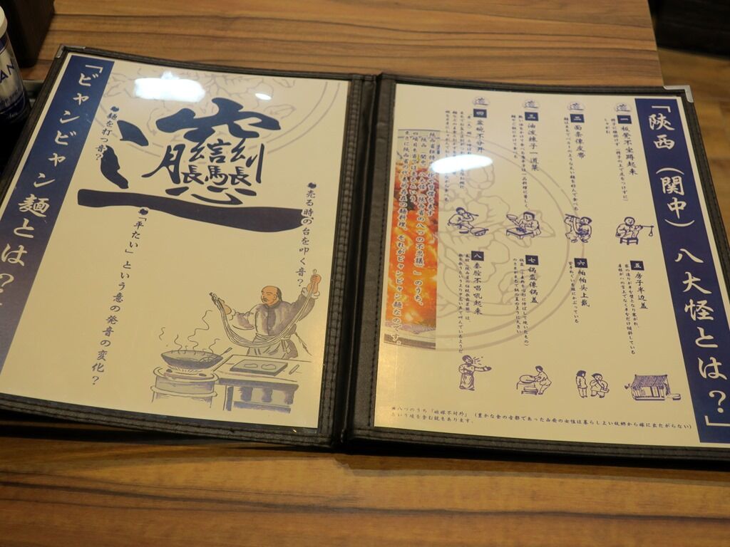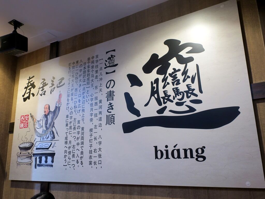 ちなみにビャンビャン麺は麺の種類で、例えば馬賊や蘭州牛肉麺の様に、注文が入ってから麺帯を台に打ち付けて伸ばしてた麺。麺を台に打ち付ける音から、ビャンビャン麺という説も。