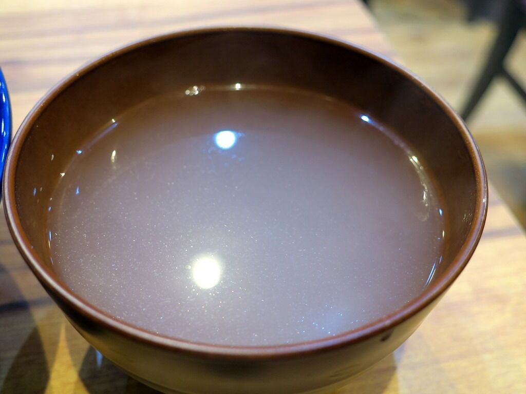 一緒にお椀で提供される温かい汁は麺の茹で汁、いわゆるそば湯。麺を食べながら一緒に飲むように勧めまれます。