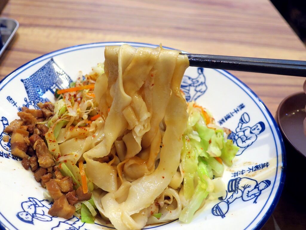 麺は平打ちの超幅広いタイプ。デファで麺量210gとボリュームもあります。なお麺少なめで150円引きになります。その麺は、まさに打ち立てでみずみずしくツルッツルでもっちもち食感。器の底には黒酢ベースのタレ。