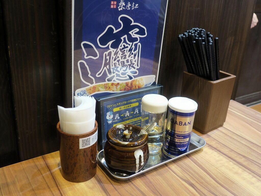 箸は洗い箸でエコ仕様。卓上調味料は、自家製ラー油、酢、GABANホワイトペッパー。