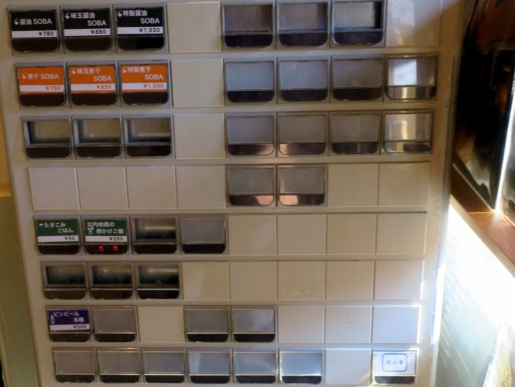 結局7分遅れで開店、早っ^^; 入店すると、まず券売機で食券購入です。主なメニューは、醤油SOBA780円、煮干SOBA750円、他。塩SOBA近日販売予定。