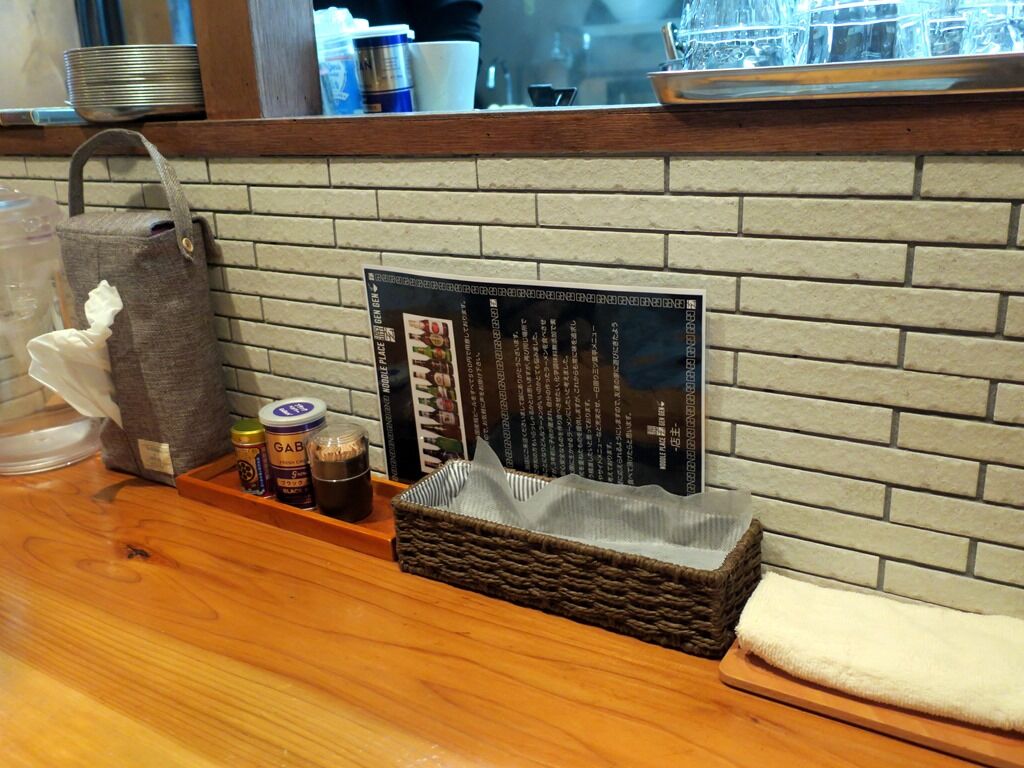 BGMはポップス。箸は洗い箸でエコ仕様。卓上調味料はGABANブラックペッパー、七味唐辛子。