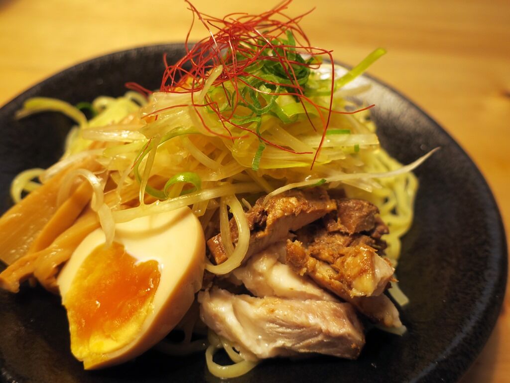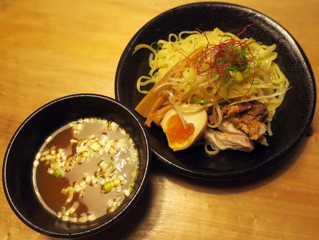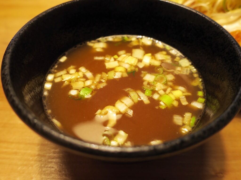 つけ汁はさらさらの豚骨醤油。「ハーブ&スパイスを30種~使用し、香り高く仕上げました」とのこと。ラーメンのタレを若干濃くしたような印象。