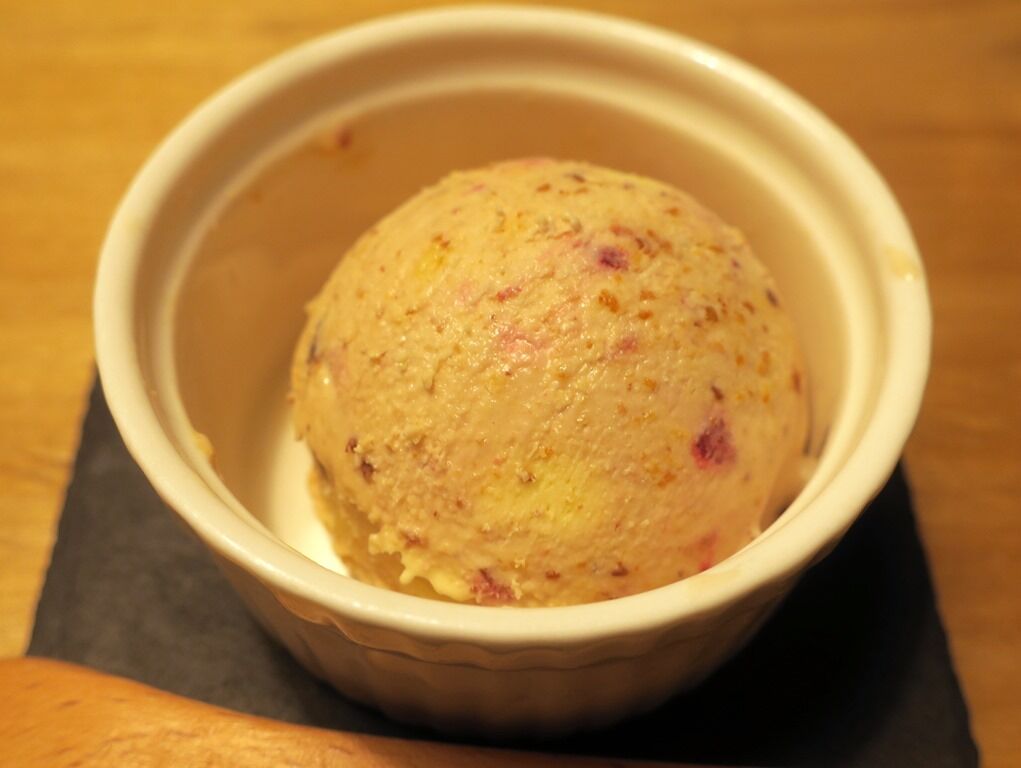 黒板メニュー「本日のオススメ」から「自家製木苺のアイス」150円。カッチンカッチンに凍っているので、スプーンを細かく入れて溶かしながらいただきます。これが目の覚めるような旨さで、店主さん洋食出身と確信。
