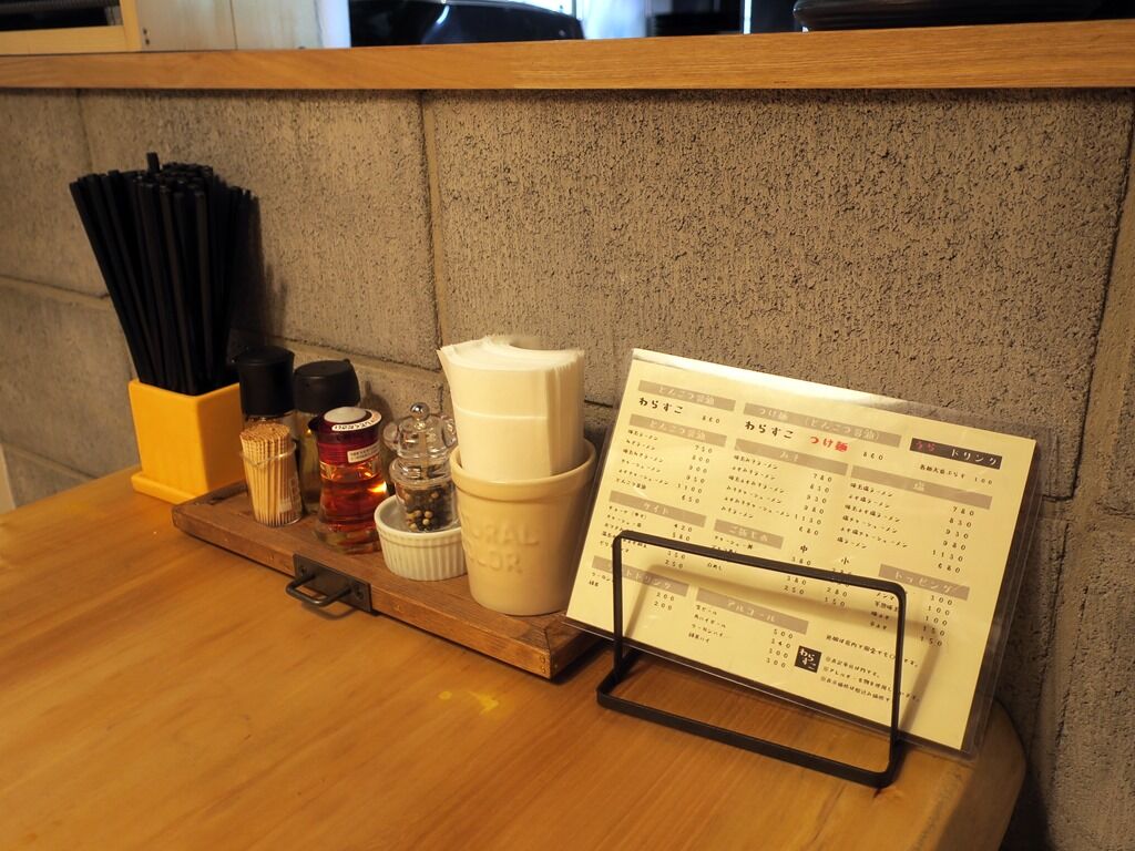 BGMはポップス。箸は洗い箸でエコ仕様。卓上調味料は醤油、酢、ラー油、ミル入ミックスペッパー。