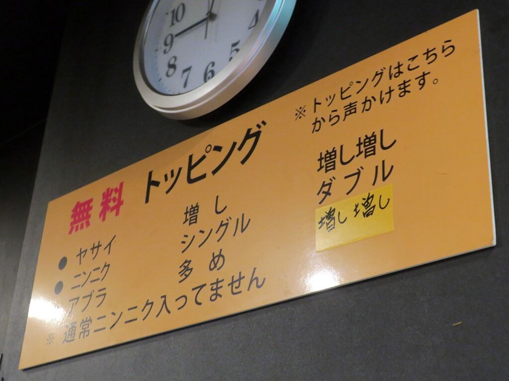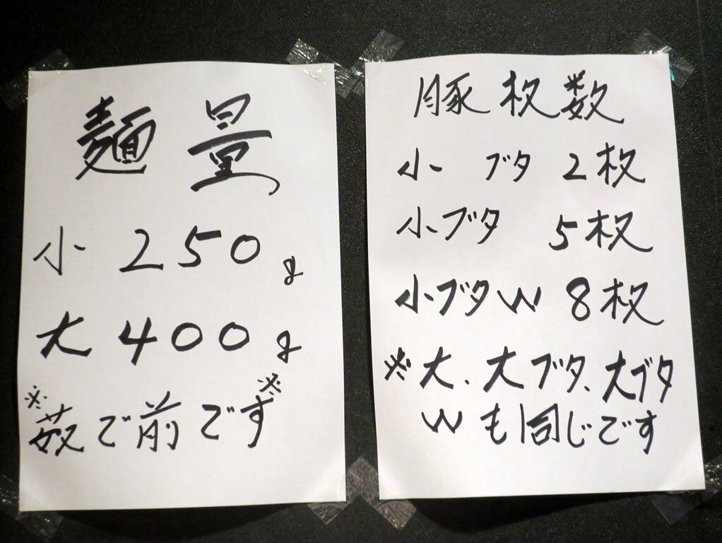 麺量は小250g大400g。小の麺少なめ、麺半分対応可能だそうです。無料トッピングはヤサイ、ニンニク、アブラ。コールのタイミングは提供直前。